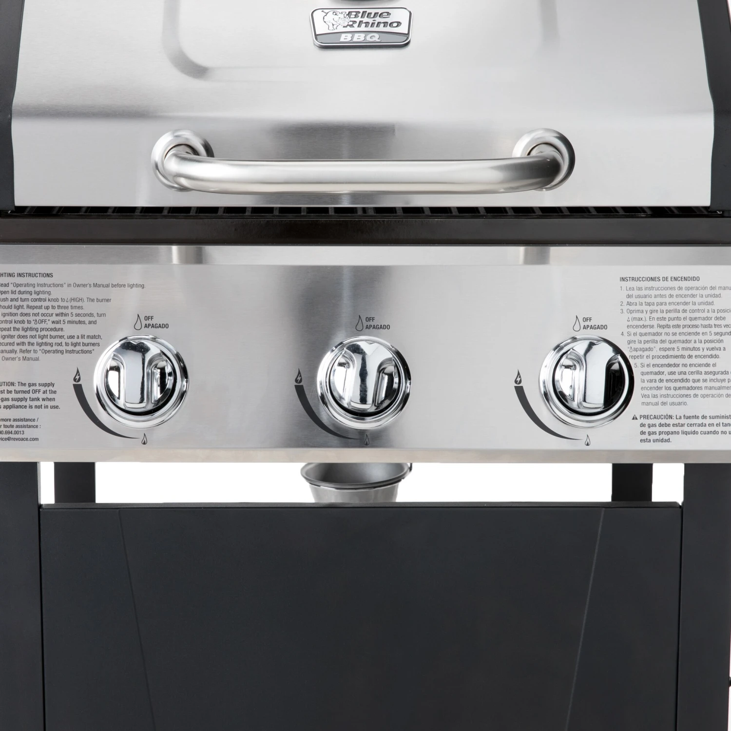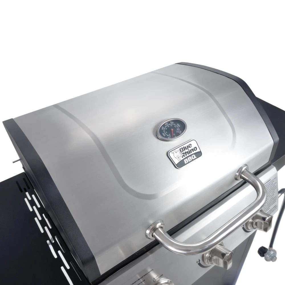 The Blue Rhino 3 burner stainless steel gas grill features three stainless steel burners for a total of 27000-BTU of power. Cook up to 25 burgers at a time. A push and turn ignition makes this grill easy to light and simple to use. Side shelves offer extra space. The wheels make transporting easy for your next event.