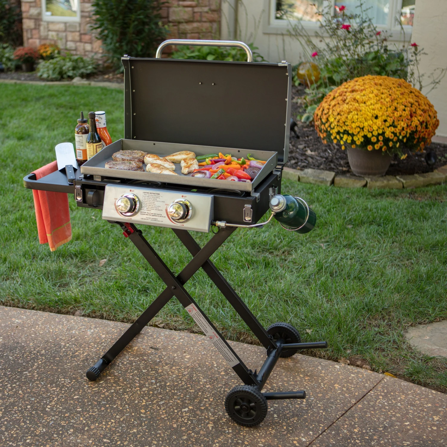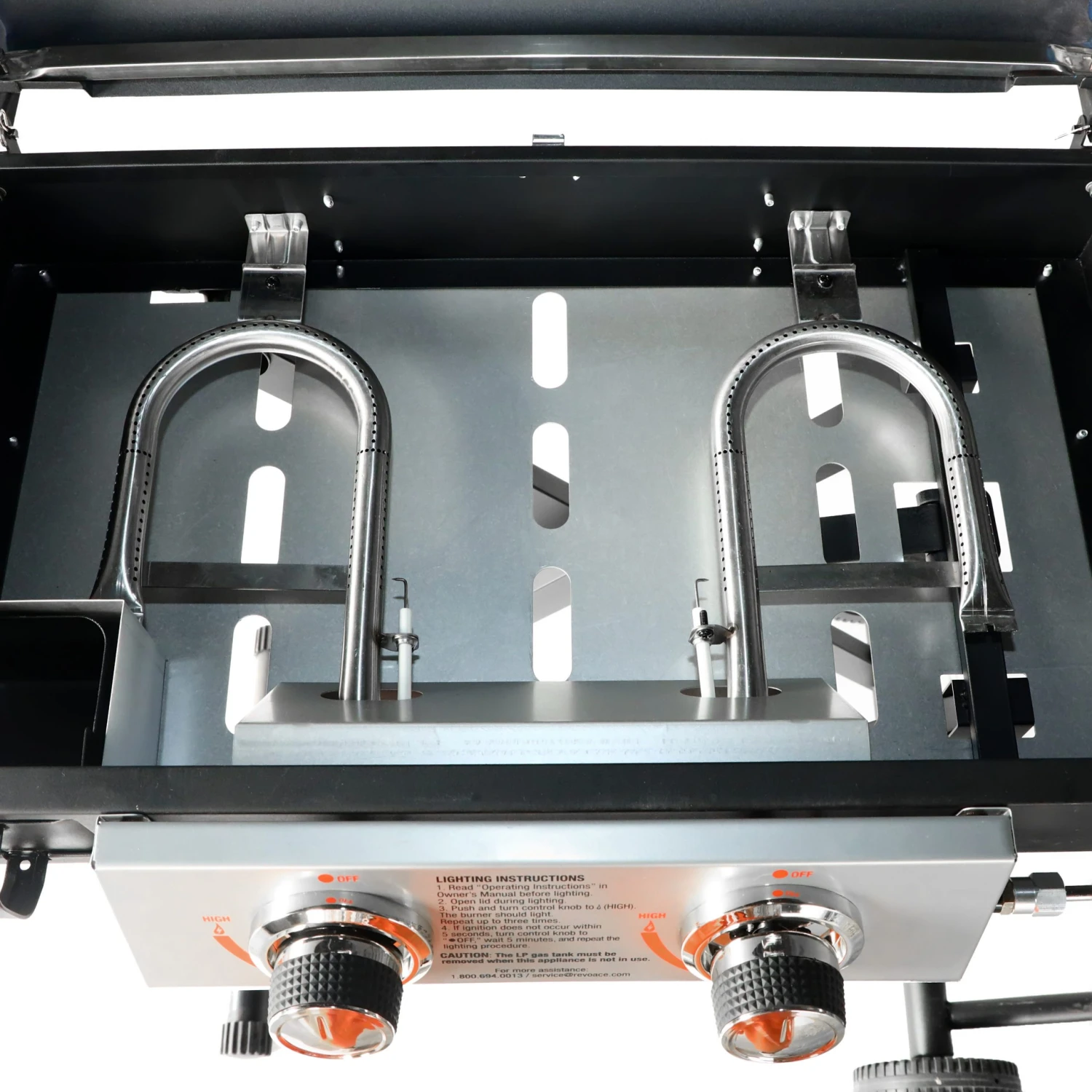 The Blue Rhino® 2 burner portable Razor™ griddle grill has plenty of room to cook all your favorite foods; perfect for backyard barbecues, camping and tailgating. With the integrated front access drain and cup, cooking and clean-up is a snap. The versatile cooking surface is great for breakfast, lunch and dinner while the unique mobile cart design makes it easy to folds for storage or transportation. With a side shelf and attached lid you can prep and cook.