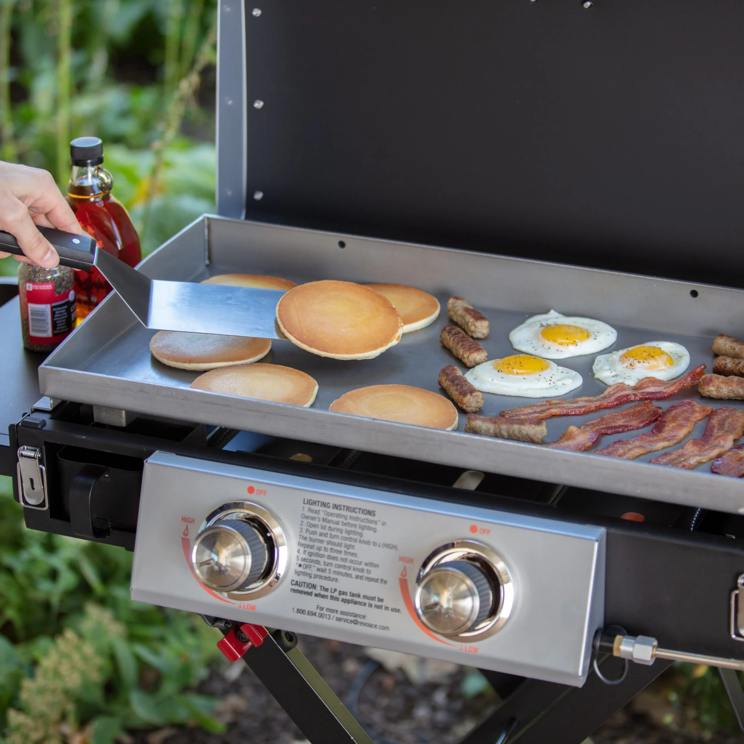 - Thick rolled-steel pre-seasoned griddle top/cooking surface