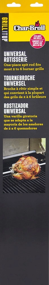 - 1-Piece spit rod designed to fit most 2 to 6 burner grills