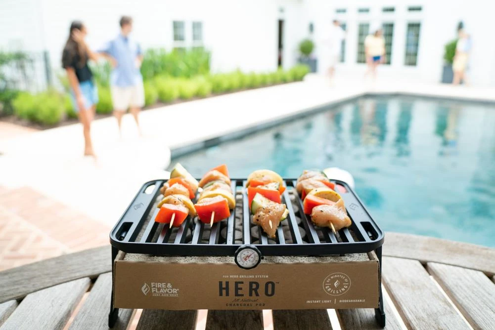 Hero™ makes grilling simple, clean, and portable. It features a fast set up and no mess, eco-friendly charcoal pods that are ready in ten minutes to give you an hour of grill time. The grill is dishwasher safe, making clean up fast and easy. The charcoal pods are an environmentally friendly fuel choice compared to petroleum based alternatives.