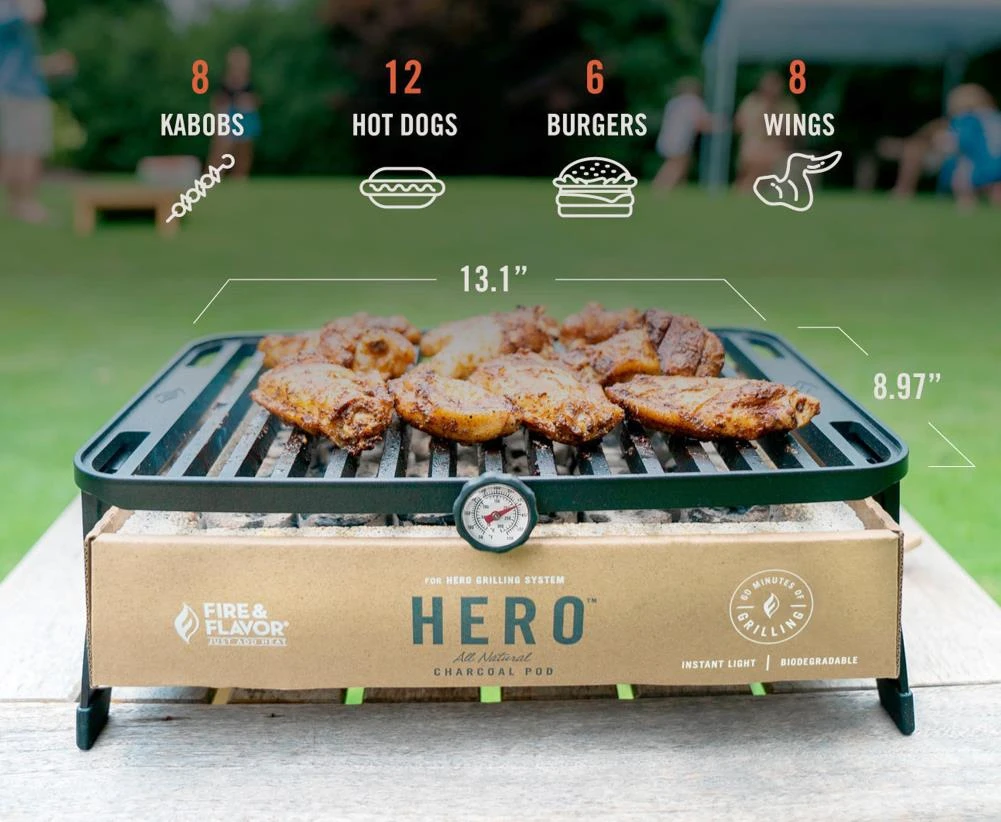 - The hero is the only premium quality small charcoal grill that is portable, lightweight, eco-friendly and packable