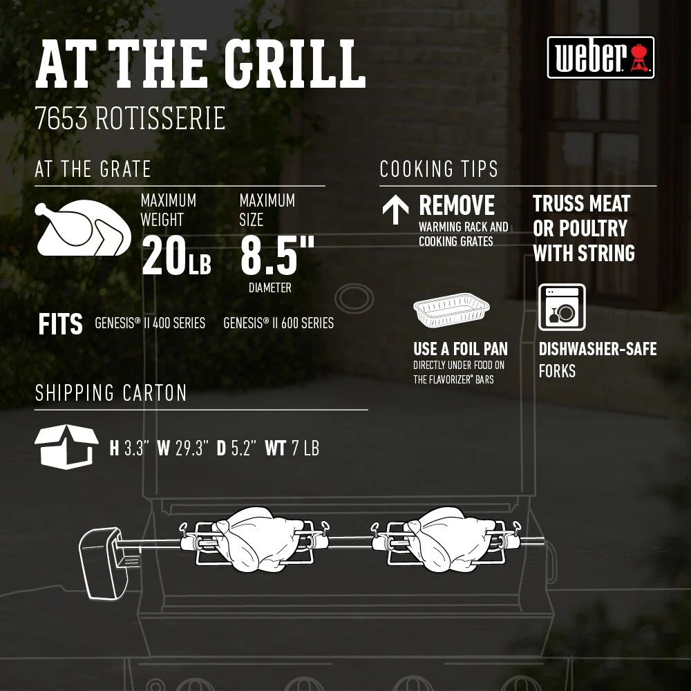 Genesis II gas grill rotisserie designed for the four and six burner grills.