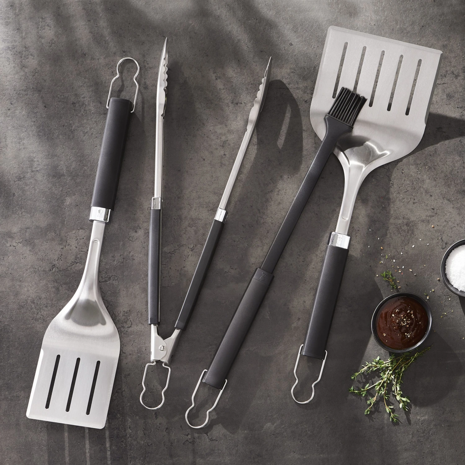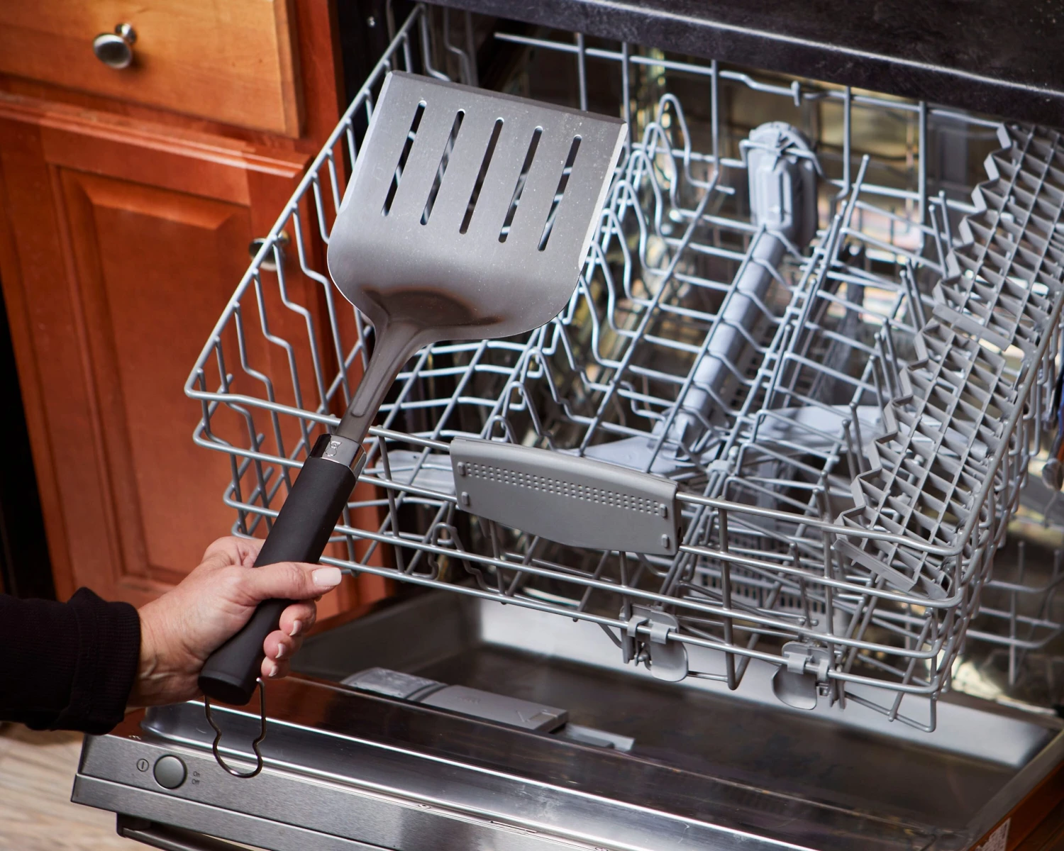 Lift and move large cuts of meat or delicate fish with ease. The wide grill spatula features a 3-sided beveled edge design that allows you lift foods with precision from any angle. The heavy-duty stainless-steel construction and soft-touch handle provide control as the oversized head picks up large cuts or fragile foods with minimal effort.
