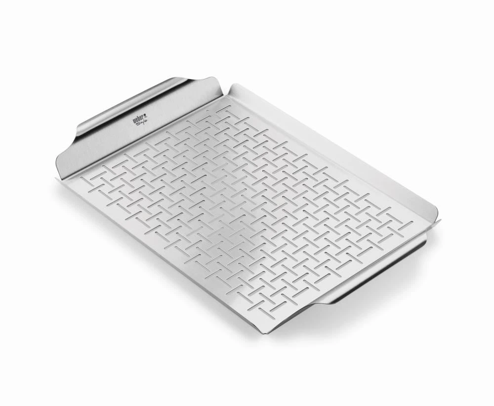 Grill vegetables, fruits and breads with ease in the Weber stainless steel grill pan. With 430-grade stainless steel, it offers exceptional heat retention. The pan has slits that enable the juices to flow out and let your food breath.